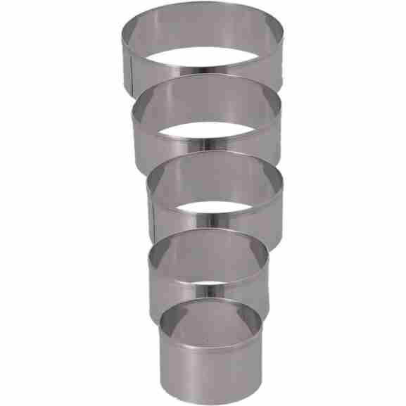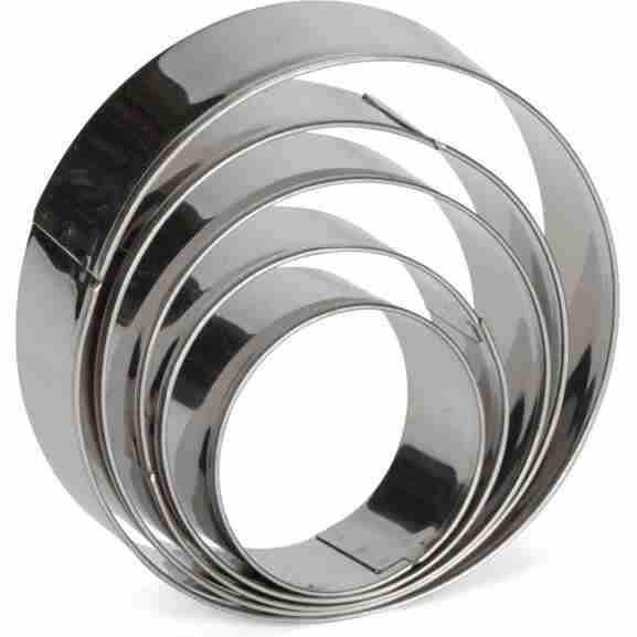Een set van 5 ronde uitsteekvormen voor bij het bakken. Diameters: 4, 5, 6, 7 en 8 cm. Materiaal: RVS. Kleur: zilver.