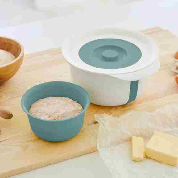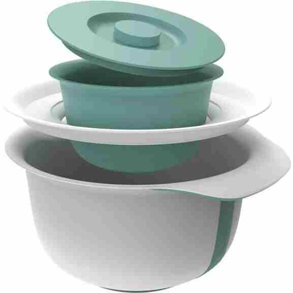 Deze praktische set combineert alles wat je nodig hebt om te bakken: twee hoogwaardige mengkommen in verschillende maten, een tweedelig deksel met spatbescherming, een comfortabele handgreep en een voet die niet wegglijdt op het werkblad. De kommen zijn daarom bijzonder geschikt om te roeren en te mixen en zijn een populaire hulp bij het bakken en koken. Stevige kom met antislipvoet Dankzij de ergonomische handgreep ligt de kom comfortabel in de hand en zorgt voor comfortabel werken. De antislipring op de vloer zorgt ervoor dat je ook bij het werken met de mixer stevig staat en dankzij de spatbeschermingsring ontstaan ??er geen vlekken op het werkblad. In de aparte kleine kom kunnen ingrediƫnten bijvoorbeeld apart worden afgewogen. Dankzij het deksel is de kom ook perfect voor het bewaren van voedsel.