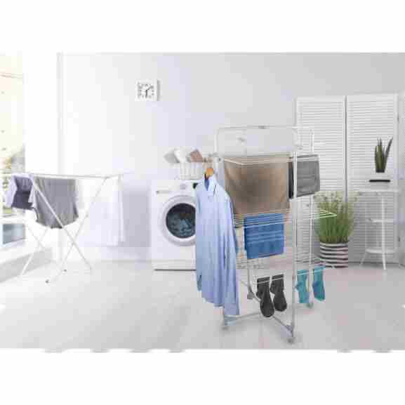 • 143 centimeter hoog, en 68 centimeter breed. De 30 meter ophangruimte is verdeeld over 6 onafhankelijke plateau’s op 3 verdiepingen. Daarnaast heeft et rek 4 haken waar je per stuk 4 kledinghangers kwijt kunt!