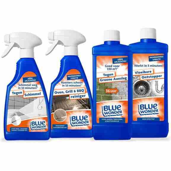 Let op Bij voorkeur het product eerst testen op een onopvallende plaats. Blue Wonder is een hoog geconcentreerd reinigingsmiddel. Verwijder gemorst product direct met water om schade te voorkomen. Oppervlakken die met levensmiddelen in aanraking komen, moeten altijd zorgvuldig worden nagespoeld met schoon water om al het residu te verwijderen.