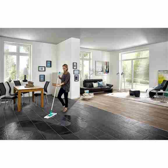 Het is afgelopen met vieze strepen en rugpijn bij het poetsen. De Leifheit Profi micro duo verwijdert met zijn speciale 2-vezel-mopdoek ook hardnekkig vuil en kan gemakkelijk met de voet worden bediend. Hierdoor is dit de idealewisser voor grote oppervlakken, zoals de keuken en kantoorruimtes. De 2-vezel-mopdoek bestaat uit de bewezen Leifheit-microvezel Duo. Rijen met de fijnste, licht verhoogde borstelharen reiken tot in de kleinste voegen en verwijderen ook hardnekkig vuil zonder enige krachtinspanning. Met zijn werkelijke mopbreedte van 42 cm bespaart de Profi micro duo veel werkstappen en waardevolle tijd. Het geniale, beweeglijke 360°-scharnier maakt effectief reinigen met slingerbeweging mogelijk en omcirkelt tafel- en kastpoten. Door de compleet hoekbare steel kunnen ook lastig bereikbare plaatsen onder kasten en bedden makkelijk worden bereikt. De vloermop kan heel eenvoudig worden bediend tijdens het staan: Eenvoudig met een voetklik de mopdoek loshalen, in de apart verkrijgbare Leifheit-mopdoekpers Profi uitwringen, doek weer inspannen en klaar.