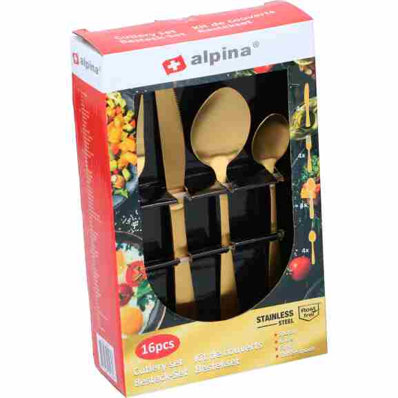 Deze supermooie bestekset van kwaliteitsmerk alpina is gemaakt van oersterk roestvrij staal. Door het minimalistische design met een mat gouden effect staat dit bestek mooi op een modern gedekte tafel en bij een dito servies.