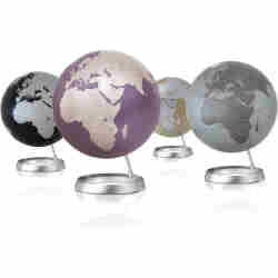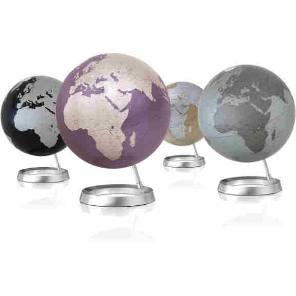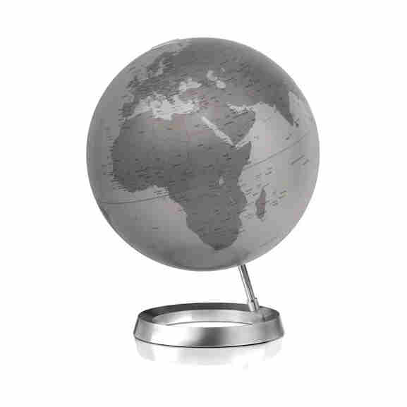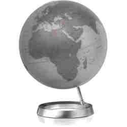 Design globe met een aluminium voet en een doorsnee van 30cm. De hoogte is 37cm. Wereldkaart in metallic silver.