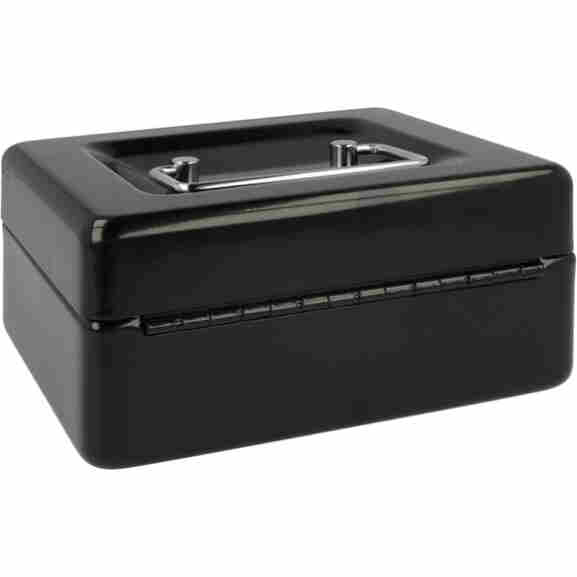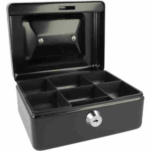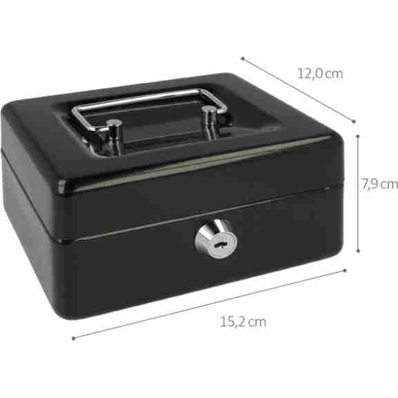 Met deze geldkist bergt u uw geld of waardevolle spullen veilig op. Deze geldkist gemaakt van staal wordt geleverd met 2 sleutels en heeft een kunststof inzet met 6 vakken voor munten. Doordat de geldkist een hangreep heeft die in de deksel valt kunt u de kist makkelijk opbergen. Afmeting: 152x120x79mm. Kleur: zwart.